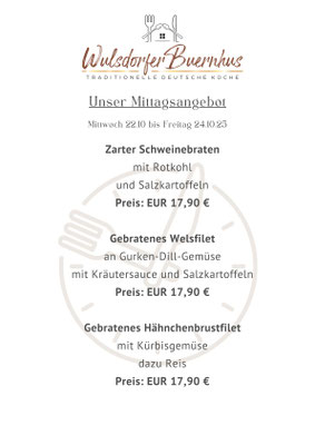 Genießen Sie im Wulsdorfer Buernhus in Bremerhaven einen wechselnden Mittagstisch mit regionalen, saisonalen Zutaten. Unsere Gerichte sind hausgemacht, abwechslungsreich und bieten auch vegetarische und leichte Alternativen. Ideal für eine gesunde Pause in gemütlicher Atmosphäre.